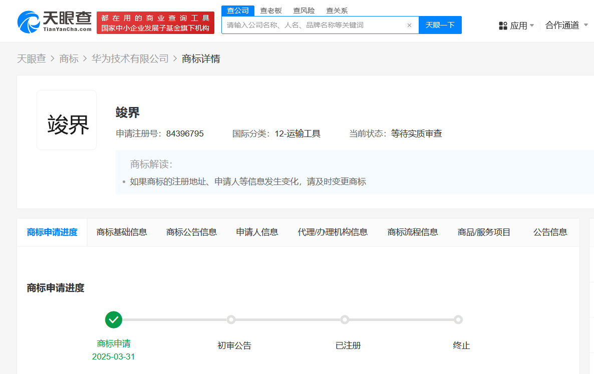 天眼查知识产权信息显示,近日,华为技术有限公司申请注册“竣界”商标,国际分类为运输工具,当前商标状态为等待实质审查。