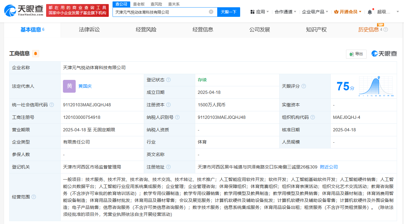 天眼查App显示,近日,天津元气悦动体育科技有限公司成立,法定代表人为黄国庆,注册资本1500万人民币,经营范围包括人工智能应用软件开发、人工智能基础软件开发、人工智能硬件销售等。股权全景穿透图显示,该公司由科大讯飞旗下安徽智慧皆成数字技术有限公司、天津元讯体育科技合伙企业(有限合伙)共同持股。