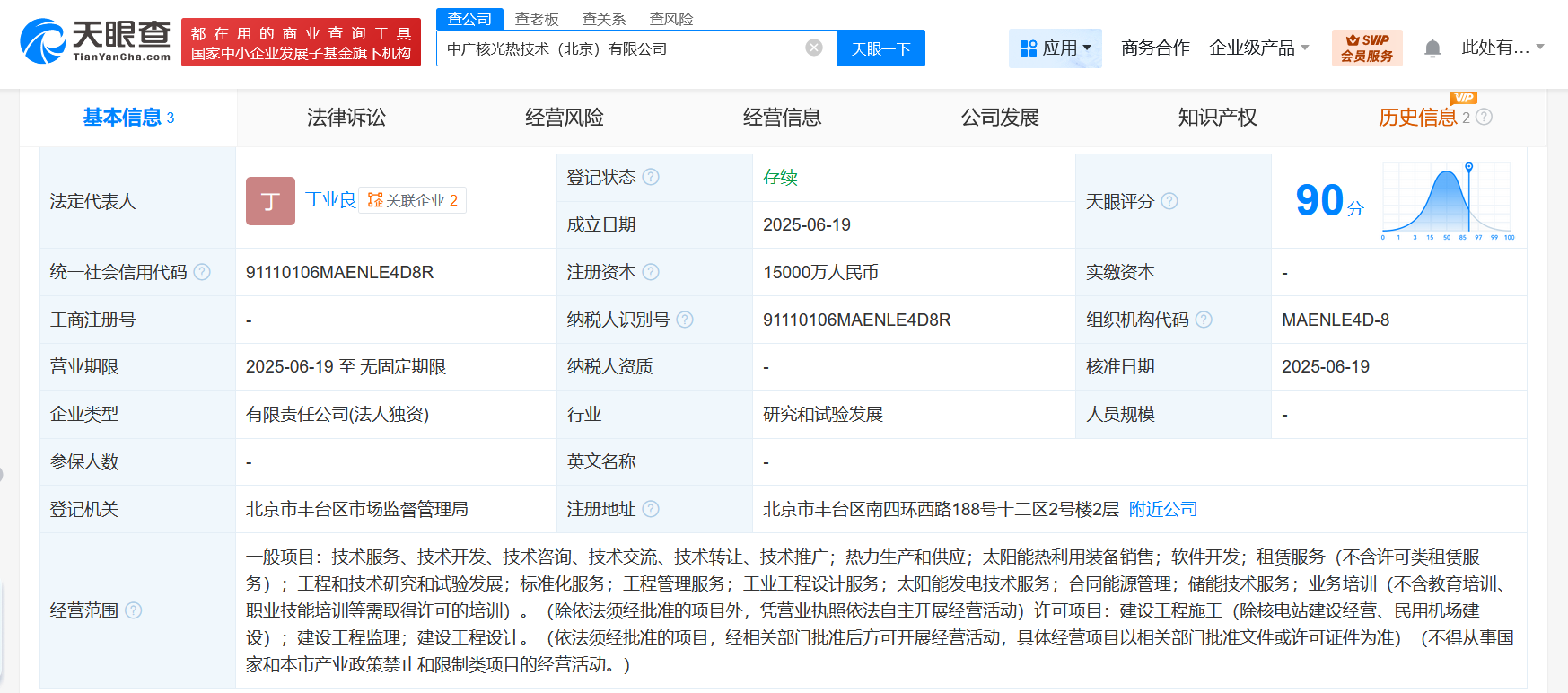 天眼查App显示,近日,中广核光热技术(北京)有限公司成立,法定代表人为丁业良,注册资本1.5亿人民币,经营范围含热力生产和供应、太阳能热利用装备销售、软件开发、工程和技术研究和试验发展、标准化服务、工程管理服务、太阳能发电技术服务、储能技术服务等,由中广核风电有限公司全资持股。