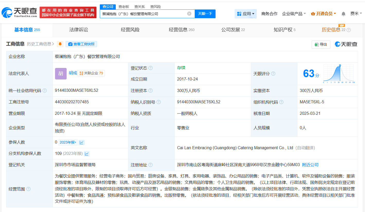 天眼查App显示,蔡澜抱抱(广东)餐饮管理有限公司成立于2017年10月,法定代表人为胡成,注册资本300万人民币,由深圳蔡澜抱抱企业管理有限公司全资持股,实际控制人为GTMS Catering Holdings Limited。值得注意的是,GTMS Catering Holdings Limited间接持有深圳市甘棠明善企业管理集团有限公司、深圳蔡澜抱抱企业管理有限公司、深圳力加餐饮管理有限公司等90余家企业。