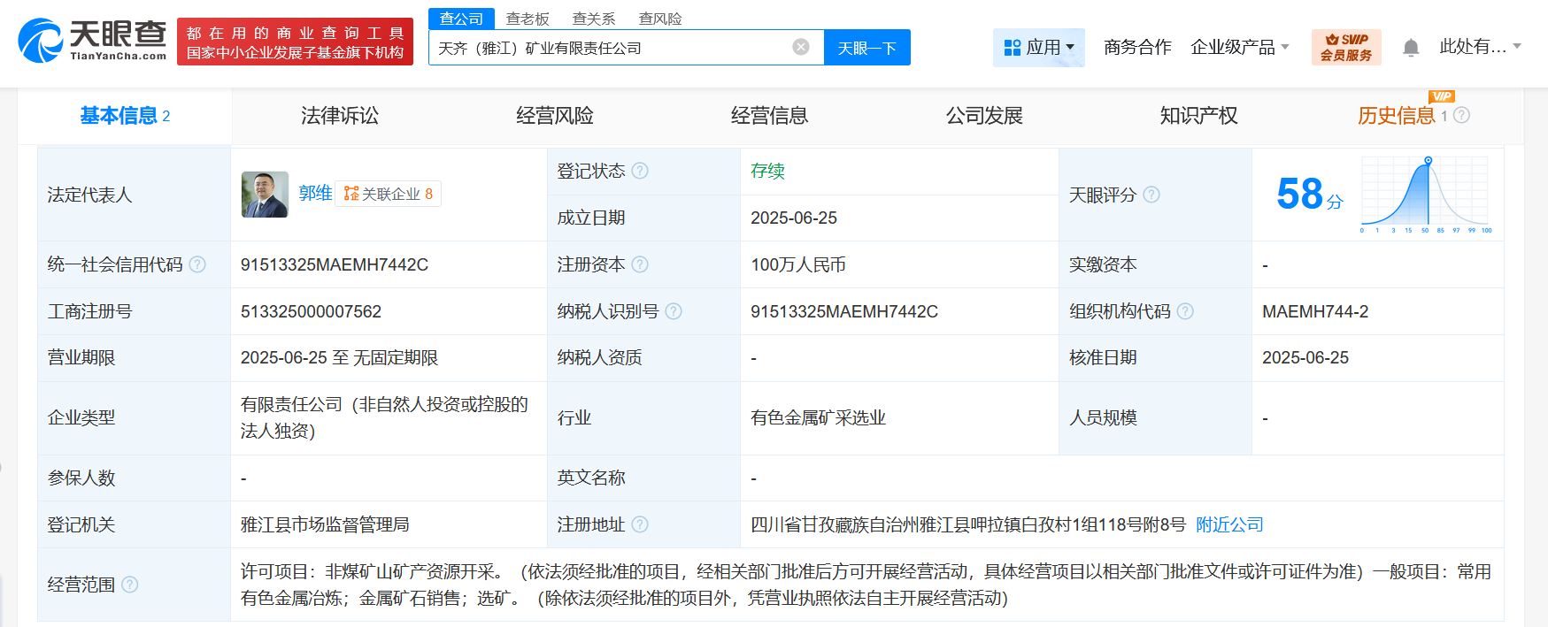 天眼查App显示,近日,天齐(雅江)矿业有限责任公司成立,法定代表人为郭维,注册资本100万人民币,经营范围为非煤矿山矿产资源开采、常用有色金属冶炼、金属矿石销售、选矿。股东信息显示,该公司由天齐锂业(002466)全资持股。