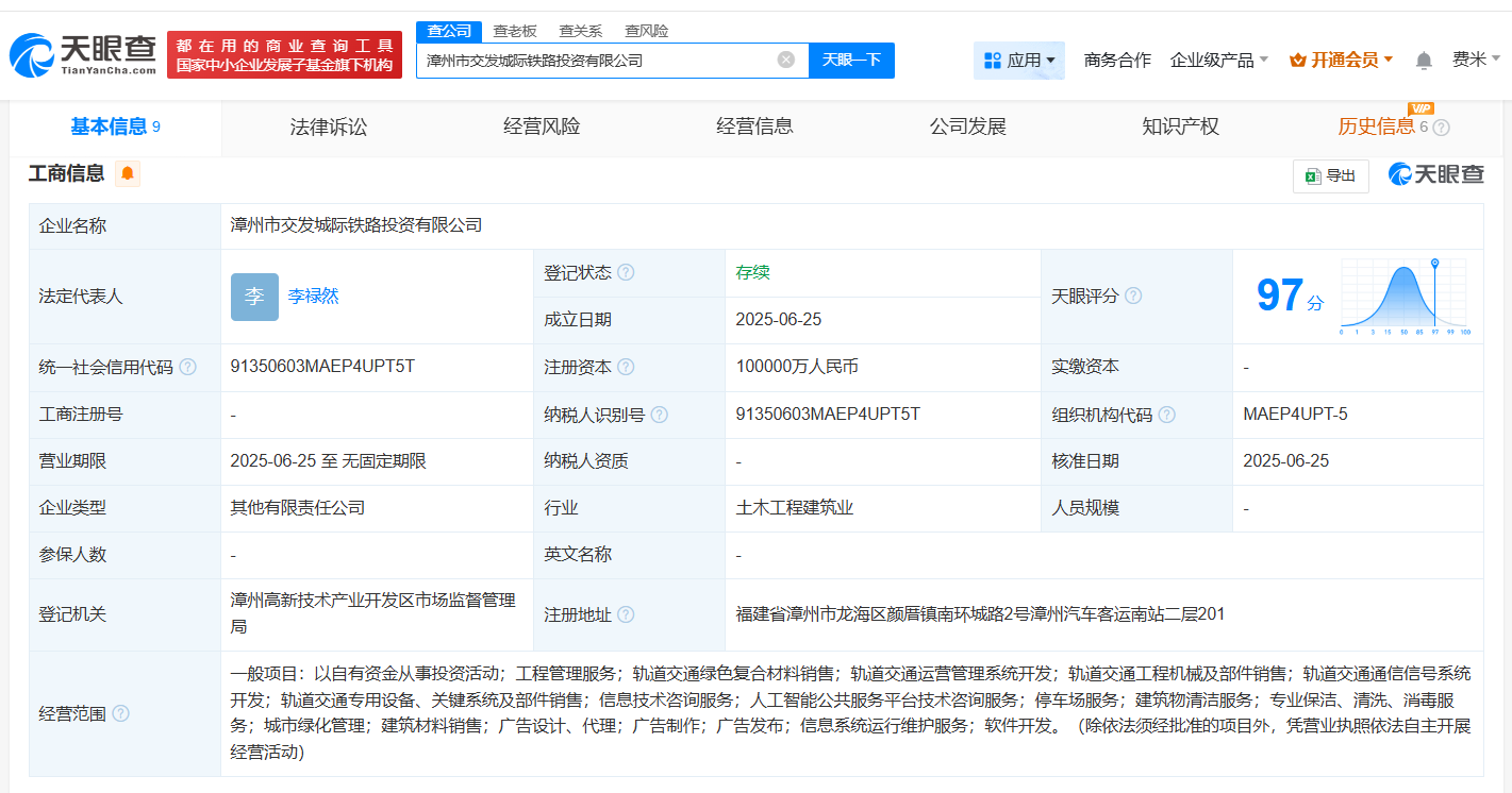 天眼查App显示,近日,漳州市交发城际铁路投资有限公司成立,法定代表人为李禄然,注册资本10亿人民币,经营范围包括以自有资金从事投资活动、工程管理服务、轨道交通绿色复合材料销售、轨道交通运营管理系统开发、轨道交通工程机械及部件销售、轨道交通通信信号系统开发等,由漳州市交通发展集团有限公司、漳州市九龙江集团有限公司、福建漳龙集团有限公司共同持股。