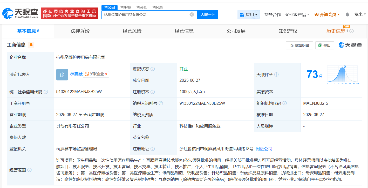 天眼查App显示,近日,杭州朵薇护理用品有限公司成立,法定代表人为徐嘉斌,注册资本1000万人民币,经营范围包括卫生用品和一次性使用医疗用品生产、互联网直播技术服务、个人卫生用品销售、卫生用品和一次性使用医疗用品销售、第一类医疗器械销售、第一类医疗器械生产等。股权全景穿透图显示,该公司由浙江朵薇护理用品有限公司全资持股,后者由杭州衡研科技有限公司、杭州昕燕文化创意有限公司、杭州龙则灵网络科技有限公司、黄子韬共同持股。值得一提的是,今年5月以来,浙江朵薇护理用品有限公司已成立了3家公司,分别是湖北朵薇护理用品有限公司、杭州朵薇供应链有限公司、宁波朵玥科技有限公司。