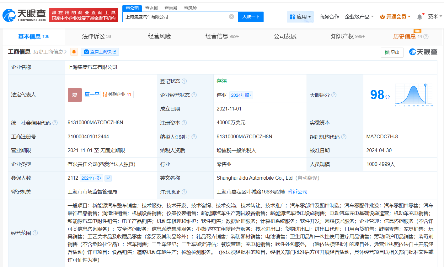 上海集度汽车有限公司成立于2021年11月,法定代表人为夏一平,注册资本4亿美元,经营范围包括新能源汽车整车销售、汽车零部件及配件制造、汽车零配件批发、汽车零配件零售、汽车装饰用品销售、润滑油销售等,由集度汽车(香港)有限公司全资持股。