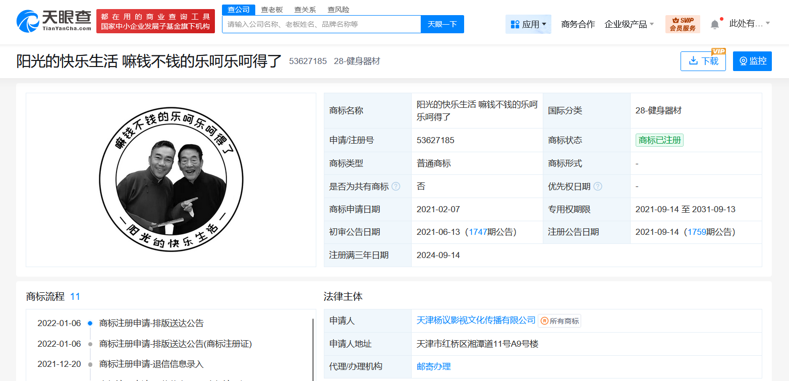 天眼查App显示,杨光相声社商标持有公司天津杨议影视文化传播有限公司成立于2009年9月,法定代表人为杨伦,注册资本300万人民币,经营范围为影视、文化活动、企业管理策划,礼仪庆典、会议服务,广告业务,文化教育信息咨询,影视器材租赁,展览展示服务,由杨义、张春梅共同持股。知识产权信息显示,该公司已注册多枚“杨光的快乐生活”“嘛钱不钱的乐呵乐呵得了 阳光的快乐生活”“杨光的快乐生活 杨议影视”等商标,国际分类涉及啤酒饮料、教育娱乐、广告销售等。