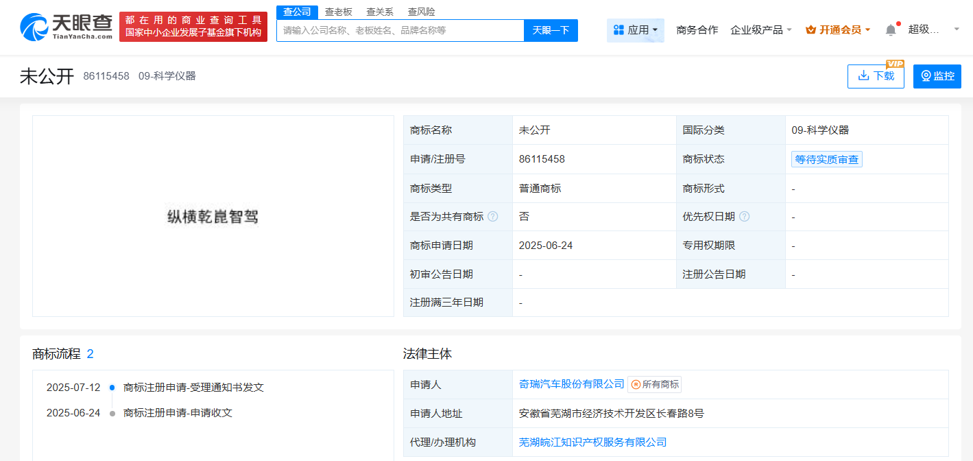 天眼查App显示,近日,奇瑞汽车股份有限公司申请注册多枚“纵横乾昆智驾”“纵横苍穹互联”“纵横舒压智能氧舱”“纵横灵感座舱”商标,国际分类涉及运输工具、网站服务等,当前商标状态均为等待实质审查。