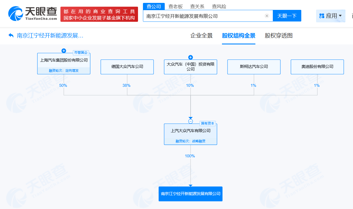 天眼查App显示,近日,南京江宁经开新能源发展有限公司成立,法定代表人为邱国平,注册资本约11亿人民币,经营范围为新兴能源技术研发、停车场服务、物业管理、股权投资、住房租赁、非居住房地产租赁。股东信息显示,该公司由上汽大众汽车有限公司全资持股。