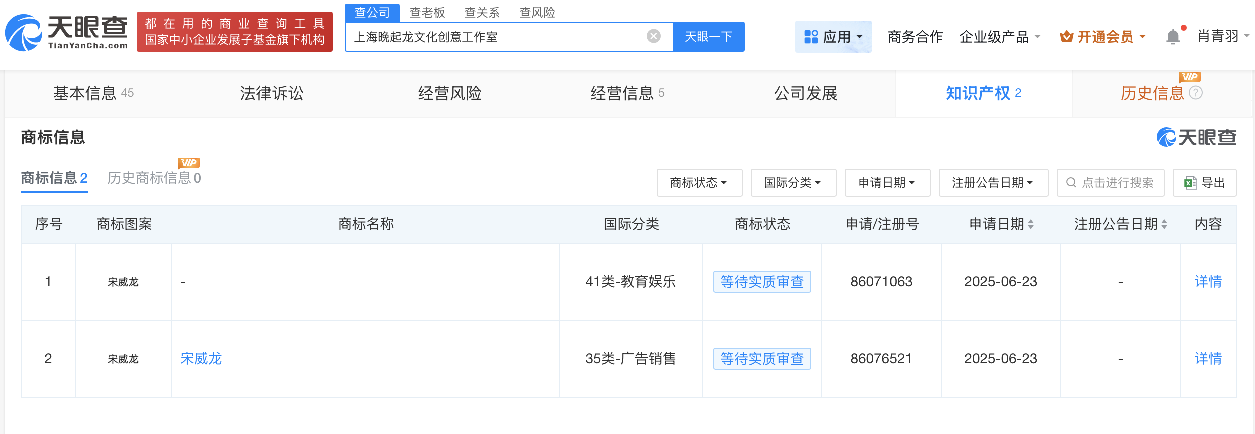 天眼查知识产权信息显示,近日,上海晚起龙文化创意工作室申请注册2枚“宋威龙”商标,国际分类涉及广告销售、教育娱乐,当前商标状态均为等待实质审查。此外,宋威龙名下海南早起龙文化创意工作室新增简易注销公告,公告期自2025年7月9日至2025年7月16日。