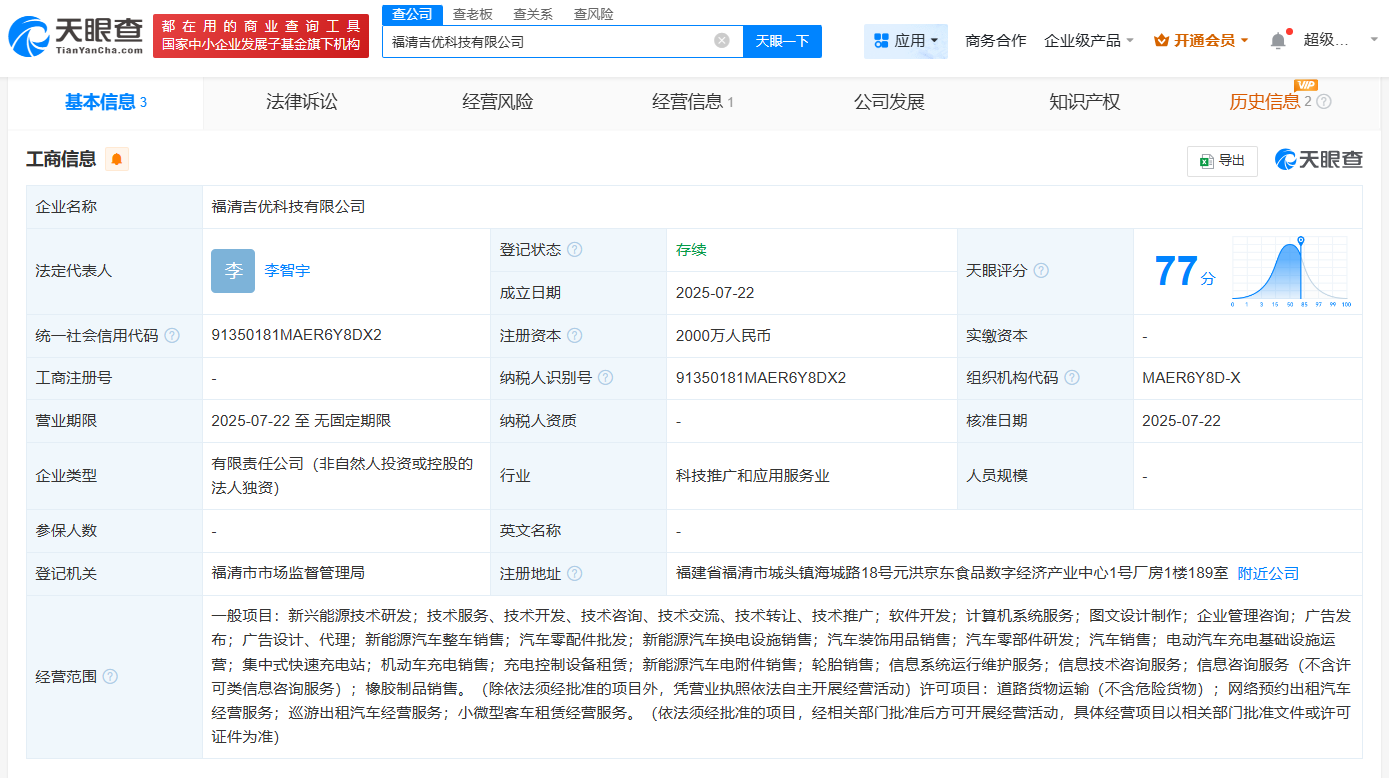 天眼查App显示,近日,福清吉优科技有限公司成立,法定代表人为李智宇,注册资本2000万人民币,经营范围包括新兴能源技术研发、新能源汽车整车销售、汽车零配件批发、新能源汽车换电设施销售等。股权全景穿透图显示,该公司由苏州市吉利优行电子科技有限公司全资持股,后者为曹操出行关联杭州优行科技有限公司全资子公司。