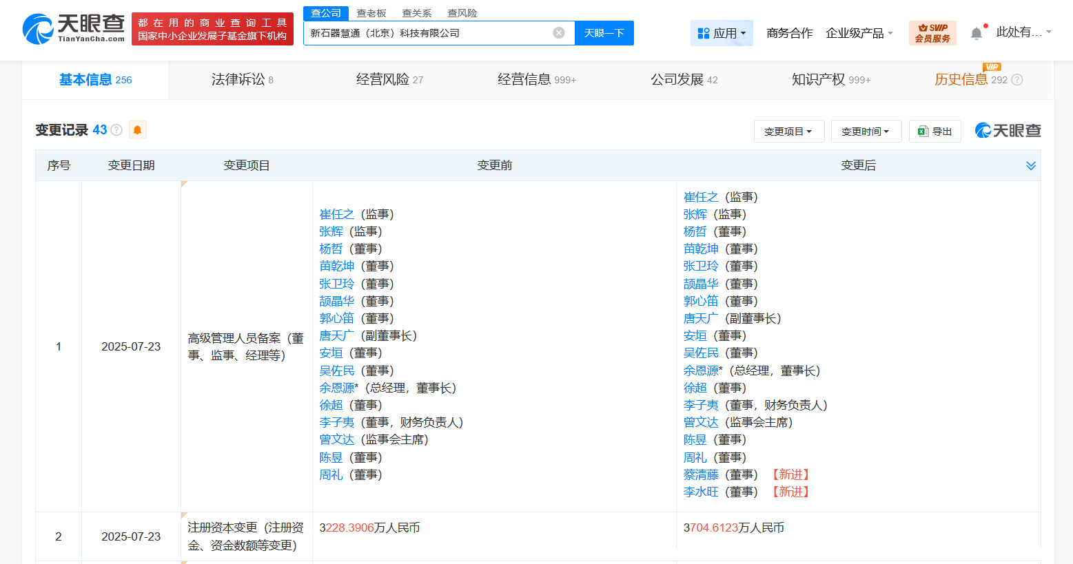 新石器慧通(北京)科技有限公司成立于2018年2月,法定代表人为余恩源,经营范围含工业机器人制造、智能机器人的研发、智能机器人销售、工业机器人销售、人工智能硬件销售、人工智能应用软件开发、服务消费机器人制造等。股东信息显示,该公司现由余恩源、杨哲、安阳战新产业投资基金(有限合伙)及上述新增股东等共同持股。