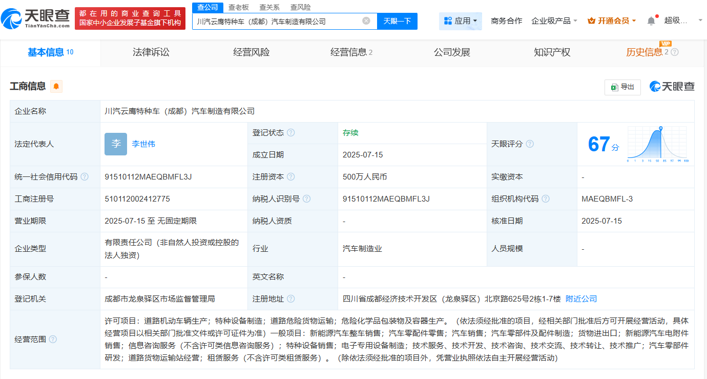天眼查App显示,近日,川汽云鹰特种车(成都)汽车制造有限公司成立,法定代表人为李世伟,注册资本500万人民币,经营范围包括道路机动车辆生产、特种设备制造、新能源汽车整车销售、汽车零配件零售等,由四川野马汽车股份有限公司全资持股。