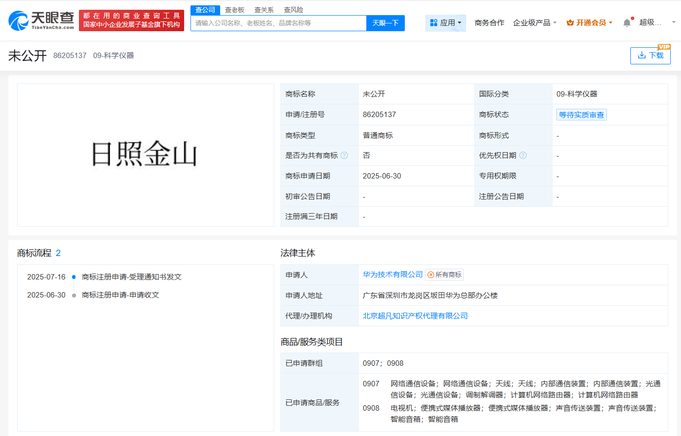 天眼查App显示,近日,华为技术有限公司申请注册1枚“日照金山”商标,国际分类为科学仪器,当前商标状态为等待实质审查。