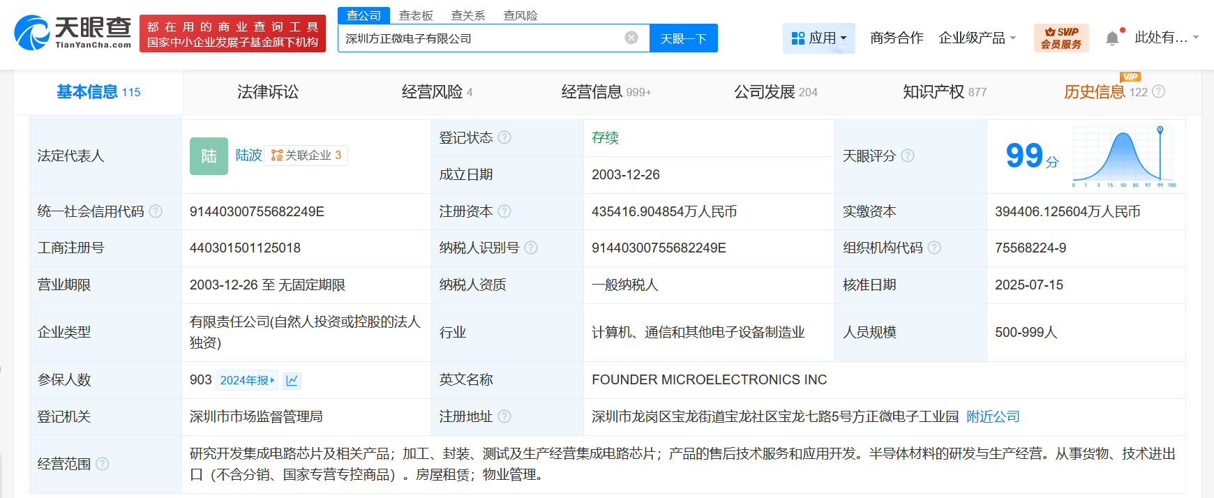 该公司成立于2003年12月,法定代表人为陆波,经营范围为研究开发集成电路芯片及相关产品,加工、封装、测试及生产经营集成电路芯片,产品的售后技术服务和应用开发,半导体材料的研发与生产经营,从事货物、技术进出口,房屋租赁,物业管理。股东信息显示,该公司由深圳市深星旭科技发展有限公司全资持股。