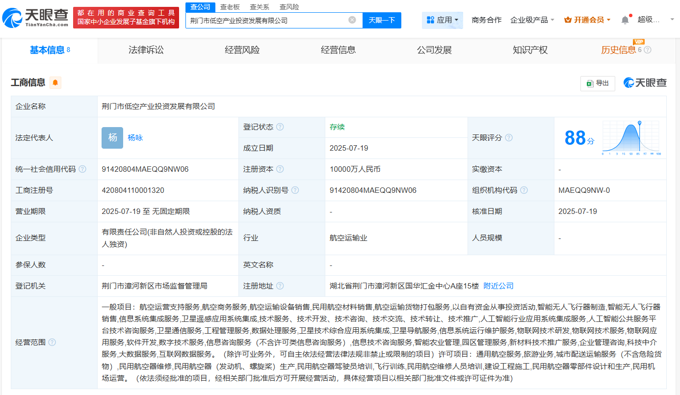 天眼查App显示,近日,荆门市低空产业投资发展有限公司成立,法定代表人为杨咏,注册资本1亿人民币,经营范围包括航空运营支持服务、航空商务服务、航空运输设备销售、民用航空材料销售、人工智能行业应用系统集成服务等。股东信息显示,该公司由荆门市交通旅游投资集团有限公司全资持股。