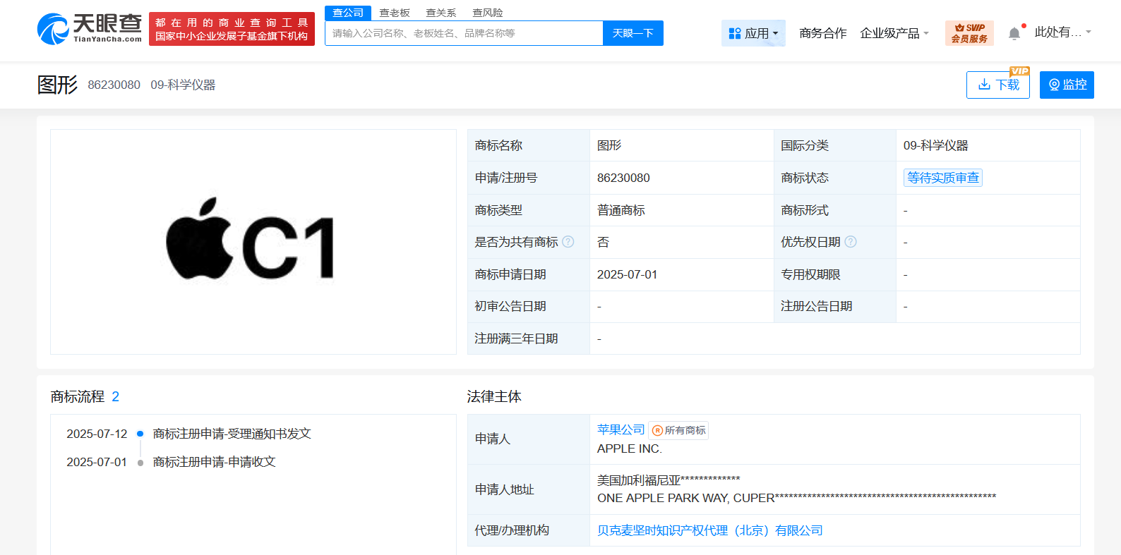 天眼查知识产权信息显示,近日,苹果公司申请注册“C1”图形商标,国际分类为科学仪器,当前商标状态为等待实质审查。