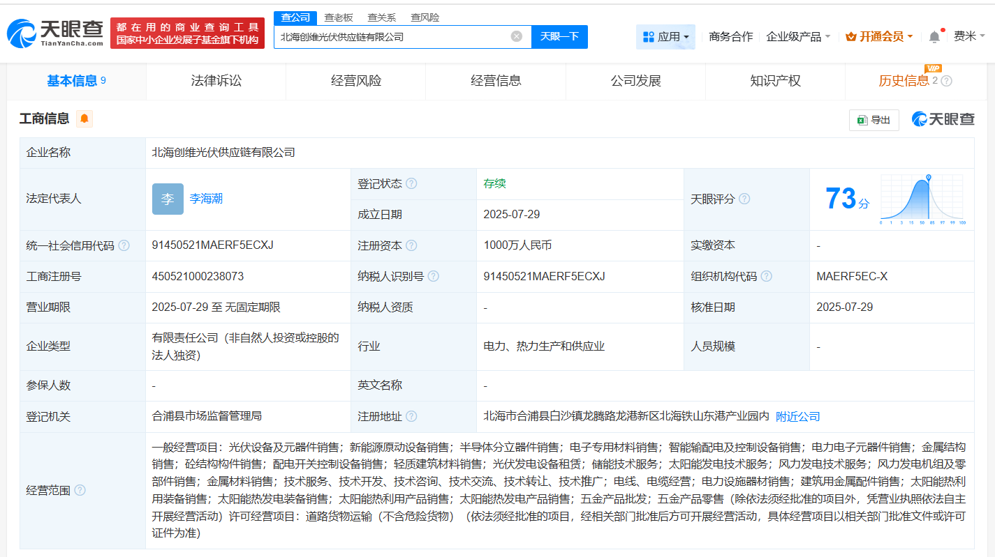 天眼查App显示,近日,北海创维光伏供应链有限公司成立,法定代表人为李海潮,注册资本1000万人民币,经营范围包括光伏设备及元器件销售、新能源原动设备销售、半导体分立器件销售等。股权全景穿透图显示,该公司由创维光伏旗下广西创维新能源投资有限公司全资持股。