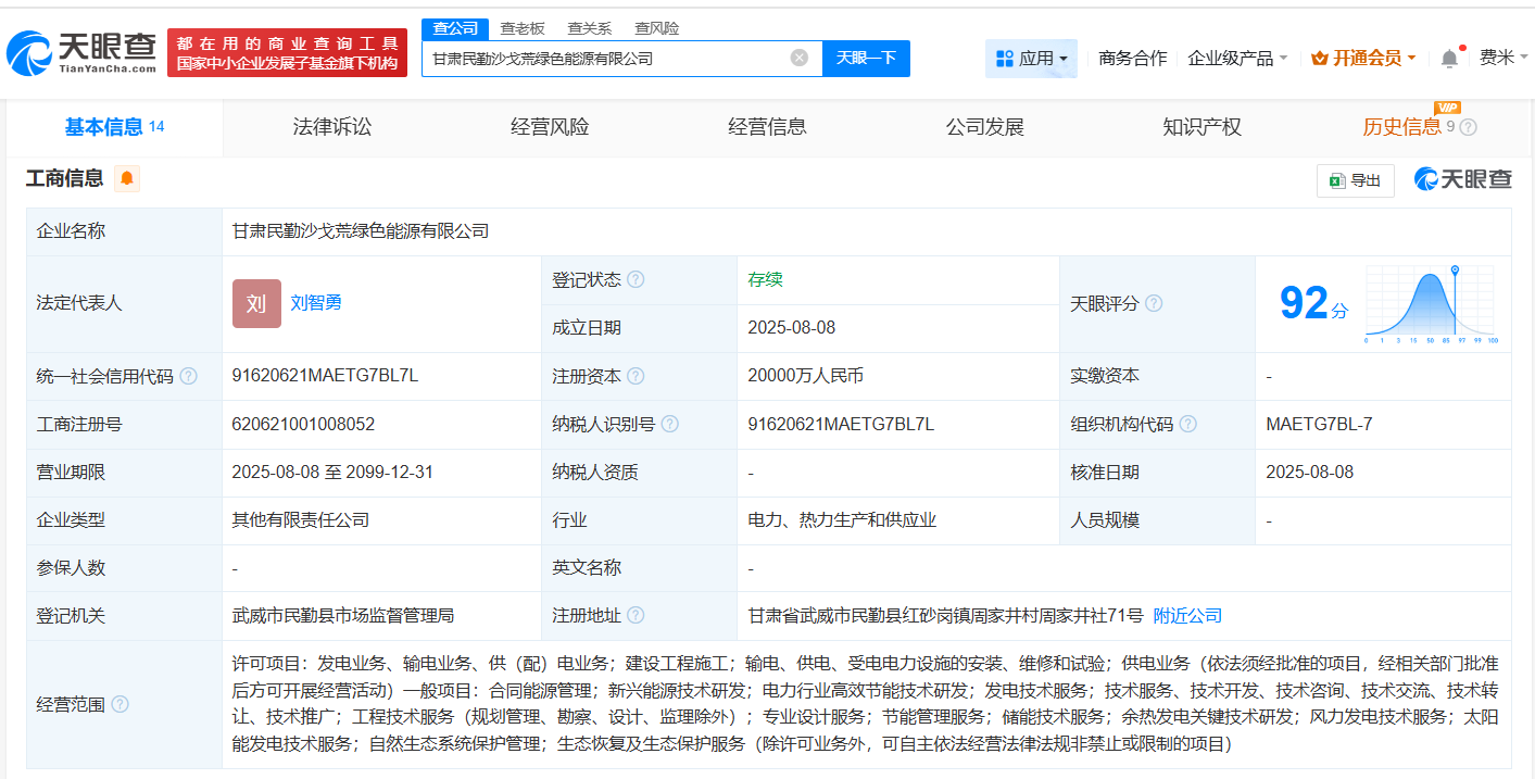 天眼查App显示,近日,甘肃民勤沙戈荒绿色能源有限公司成立,法定代表人为刘智勇,注册资本2亿人民币,经营范围包括合同能源管理、新兴能源技术研发、电力行业高效节能技术研发等。股权全景穿透图显示,该公司由华电能源(600930)及旗下甘肃华电浙能腾格里能源有限公司共同持股。
