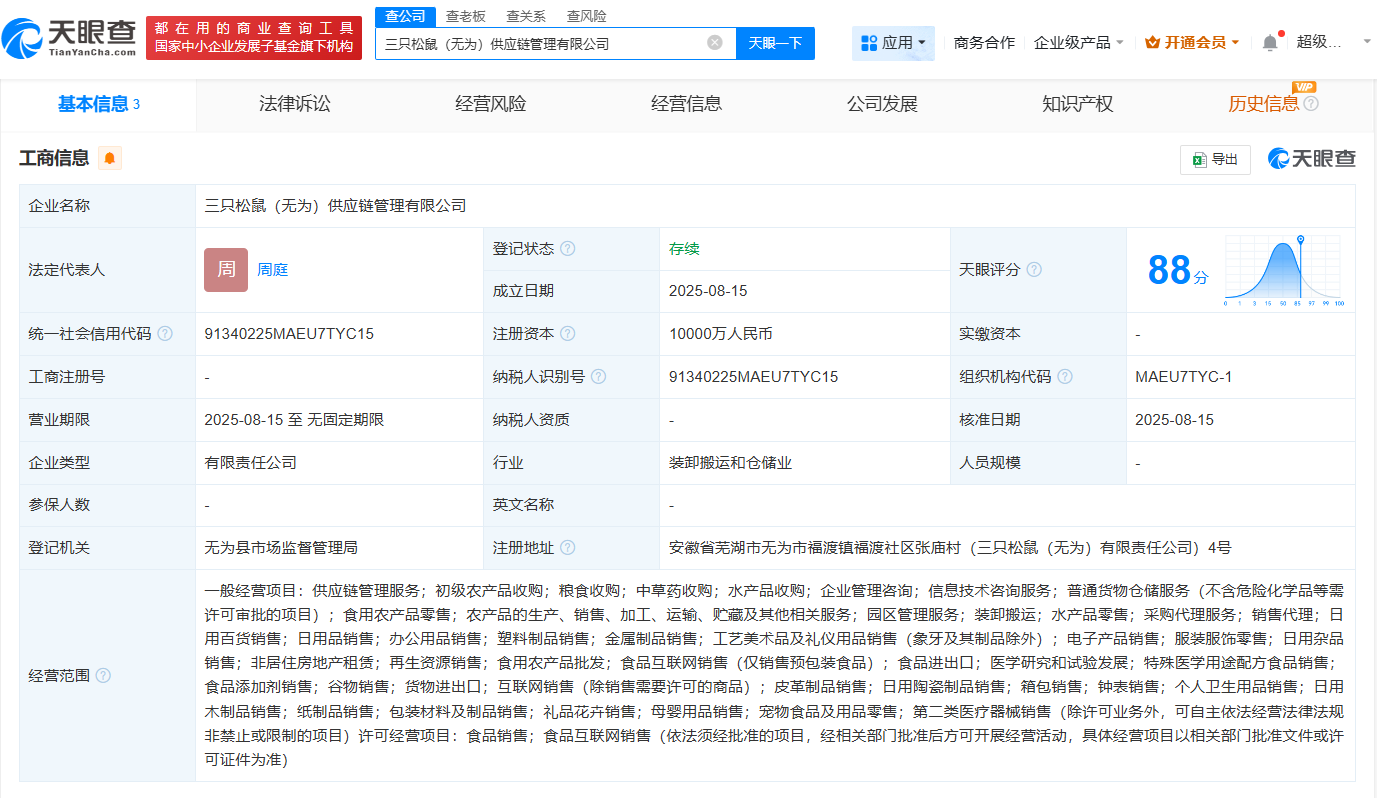 天眼查工商信息显示,近日,三只松鼠(无为)供应链管理有限公司成立,法定代表人为周庭,注册资本1亿人民币,经营范围包括供应链管理服务、初级农产品收购、食品销售、普通货物仓储服务等。股东信息显示,该公司由三只松鼠(300783)全资持股。