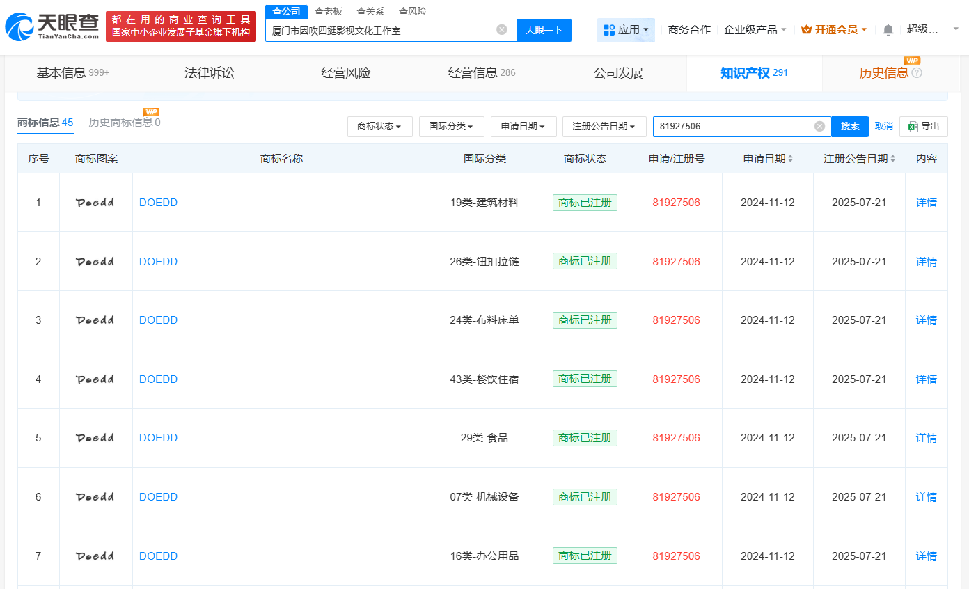 天眼查App显示,近日,厦门市因吹四挺影视文化工作室申请的多个“Doedd”商标成功注册,国际分类涉及广告销售、教育娱乐、珠宝钟表等45类。据悉,此前赵露思曾与爱犬Doe一同登上杂志,赵露思社交平台的日常分享中也经常出现Doe和点点的身影。