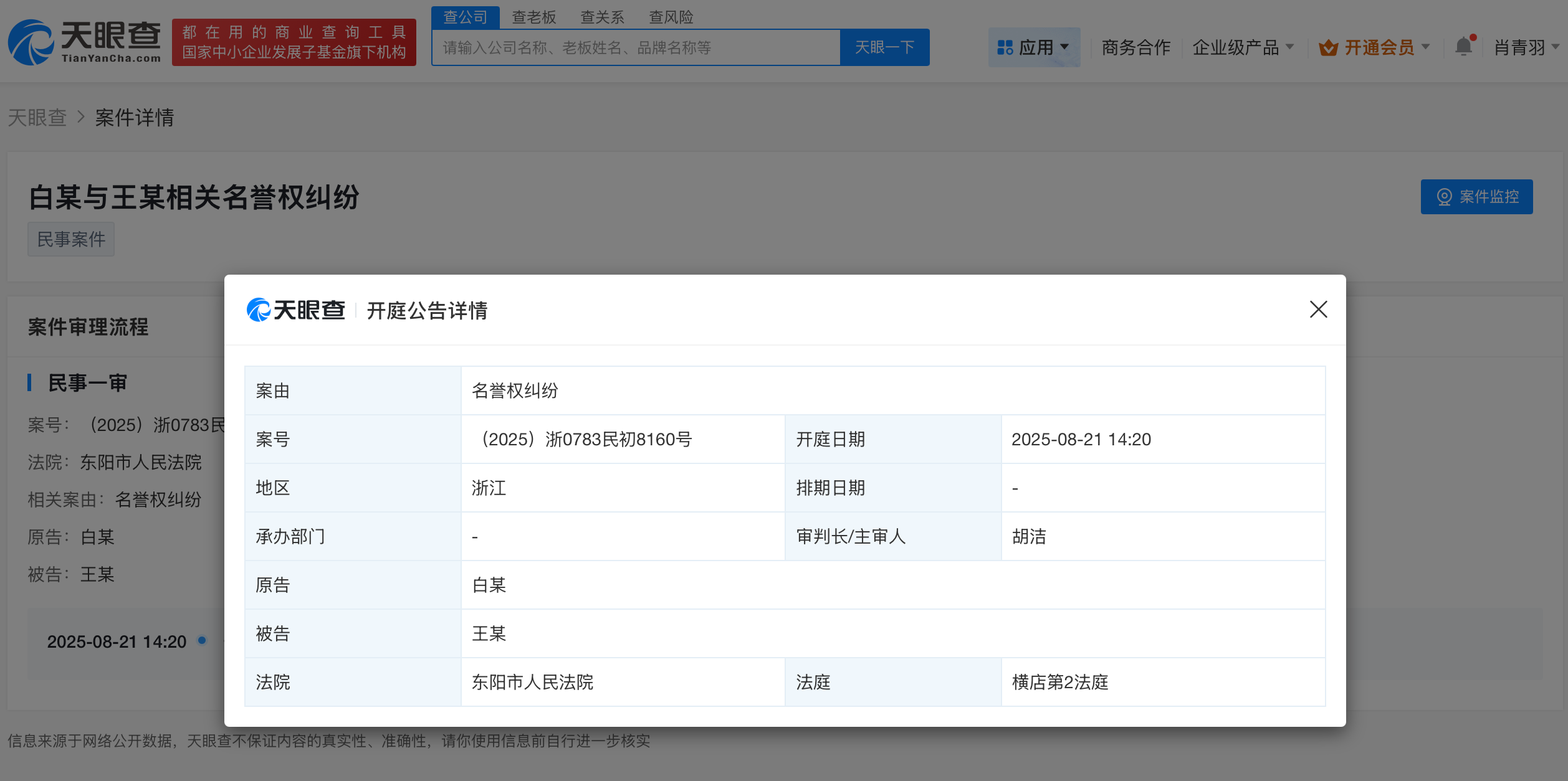 天眼查天眼风险信息显示,近日,白梦妍(白鹿)新增名誉权纠纷案件,被告为王某某,该案将于8月21日在东阳市人民法院开庭审理。