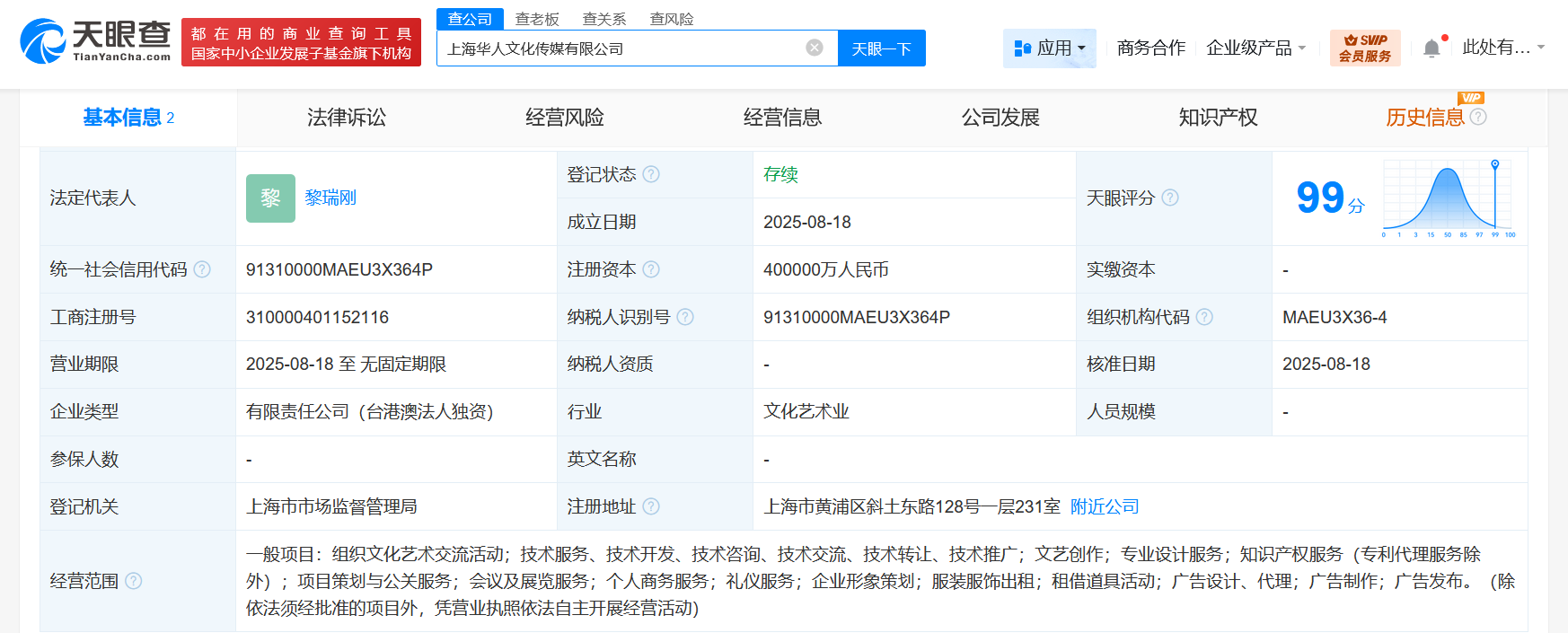 天眼查工商信息显示,近日,上海华人文化传媒有限公司成立,法定代表人为黎瑞刚,注册资本40亿人民币,经营范围含组织文化艺术交流活动、专业设计服务、知识产权服务、项目策划与公关服务、会议及展览服务、个人商务服务、礼仪服务、企业形象策划等。股东信息显示,该公司由CMC Moon GroupLimited全资持股。