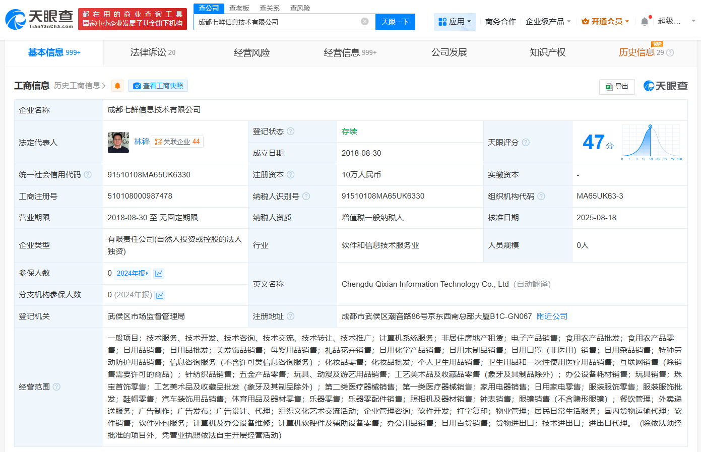 成都七鲜信息技术有限公司成立于2018年8月,法定代表人为林锋,经营范围包括非居住房地产租赁、电子产品销售、食用农产品批发、食用农产品零售等。股权全景穿透图显示,该公司由北京京东世纪贸易有限公司间接全资持股。