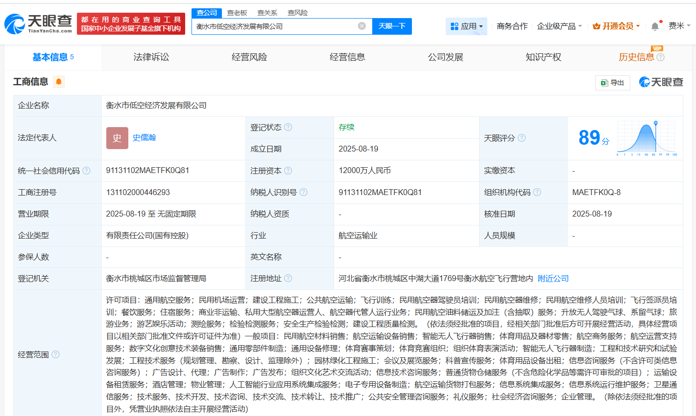 天眼查工商信息显示,近日,衡水市低空经济发展有限公司成立,法定代表人为史儒瀚,注册资本1.2亿人民币,经营范围包括通用航空服务、民用机场运营、建设工程施工等。股东信息显示,该公司由衡水市桃城区中湖通用航空产业发展有限公司、中体飞行衡水通用航空有限公司共同持股。
