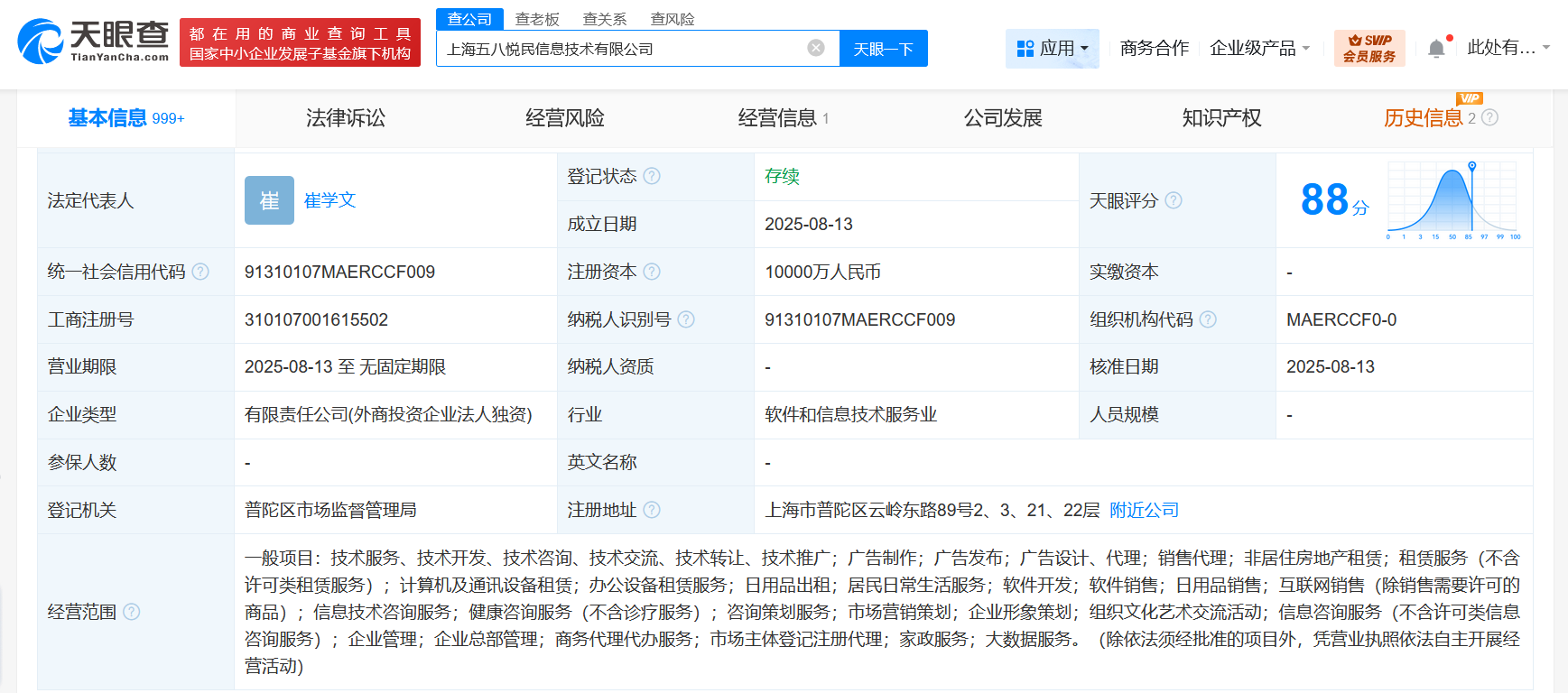 天眼查工商信息显示,近日,上海五八悦民信息技术有限公司成立,法定代表人为崔学文,注册资本1亿人民币,经营范围含非居住房地产租赁、计算机及通讯设备租赁、办公设备租赁服务、居民日常生活服务、软件开发、信息技术咨询服务、健康咨询服务、信息咨询服务、大数据服务等。股东信息显示,该公司由58同城旗下无锡乐家信息技术有限公司全资持股。