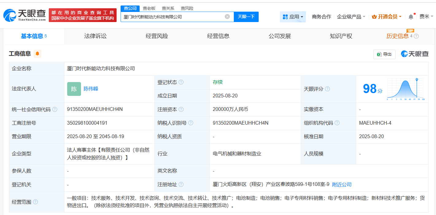 天眼查工商信息显示,8月20日,厦门时代新能动力科技有限公司成立,法定代表人为陈伟峰,注册资本20亿人民币,经营范围包括电池制造、电池销售、电子专用材料销售、电子专用材料制造、新材料技术推广服务、货物进出口等。股东信息显示,该公司由宁德时代(300750)全资持股。