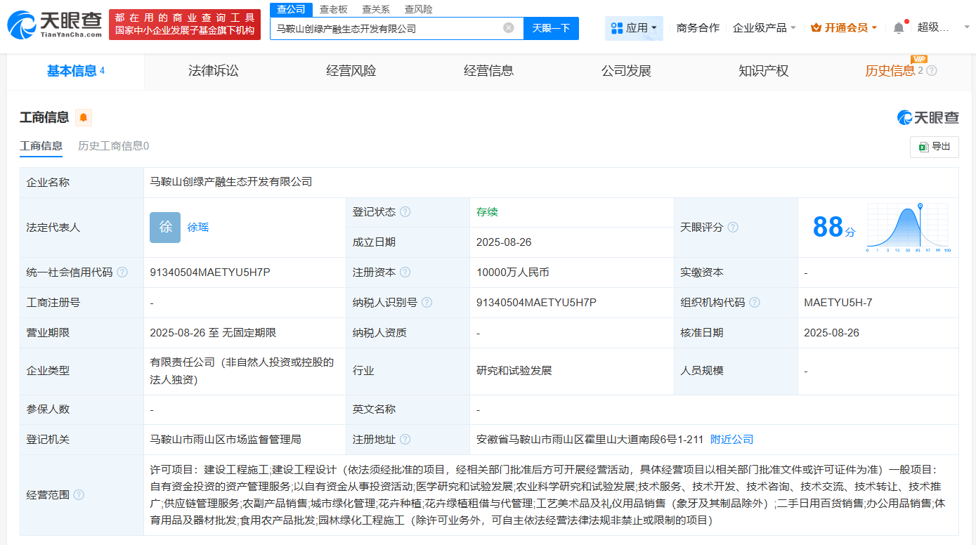 天眼查工商信息显示,近日,马鞍山创绿产融生态开发有限公司成立,法定代表人为徐瑶,注册资本1亿人民币,经营范围包括自有资金投资的资产管理服务、以自有资金从事投资活动、农业科学研究和试验发展等。股东信息显示,该公司由马鞍山市雨山高新技术创业服务股份有限公司全资持股。