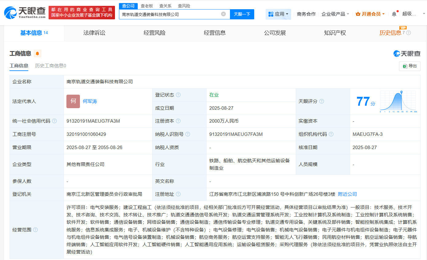 天眼查工商信息显示,近日,南京轨道交通装备科技有限公司成立,法定代表人为何军涛,注册资本2000万人民币,经营范围包括轨道交通通信信号系统开发、轨道交通运营管理系统开发、工业控制计算机及系统制造等。股东信息显示,该公司由南京轨道交通产业发展有限公司、北京泰可斯科技有限公司、通号城市轨道交通技术有限公司共同持股。