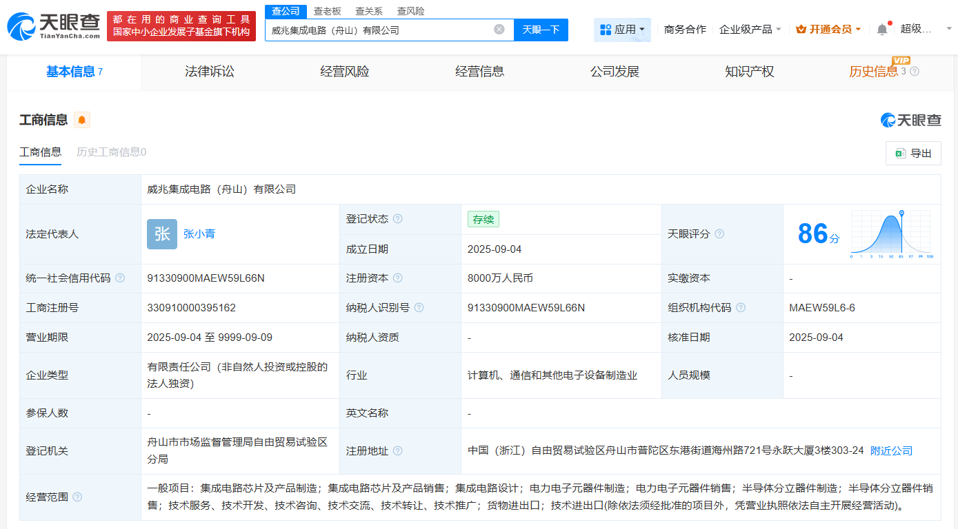 天眼查工商信息显示,近日,威兆集成电路(舟山)有限公司成立,法定代表人为张小青,注册资本8000万人民币,经营范围包括集成电路芯片及产品制造、集成电路芯片及产品销售、集成电路设计等。股东信息显示,该公司由深圳市威兆半导体股份有限公司全资持股。