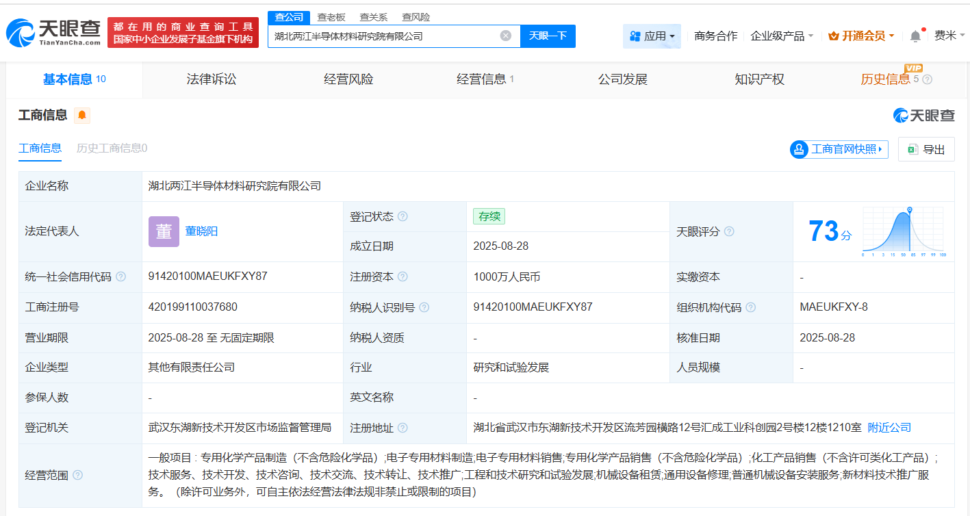 天眼查工商信息显示,近日,湖北两江半导体材料研究院有限公司成立,法定代表人为董晓阳,注册资本1000万人民币,经营范围包括电子专用材料制造、电子专用材料销售、专用化学产品销售等。股东信息显示,该公司由广钢气体(688548)、湖北江城光谷封装天使股权投资基金合伙企业(有限合伙)共同持股。