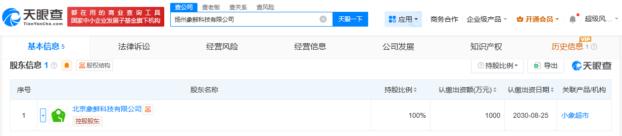 天眼查App显示,近日,扬州象鲜科技有限公司成立,法定代表人为谢益军,注册资本1000万人民币,经营范围包括餐饮管理、外卖递送服务、社会经济咨询服务等。股东信息显示,该公司由小象超市关联公司北京象鲜科技有限公司全资持股。