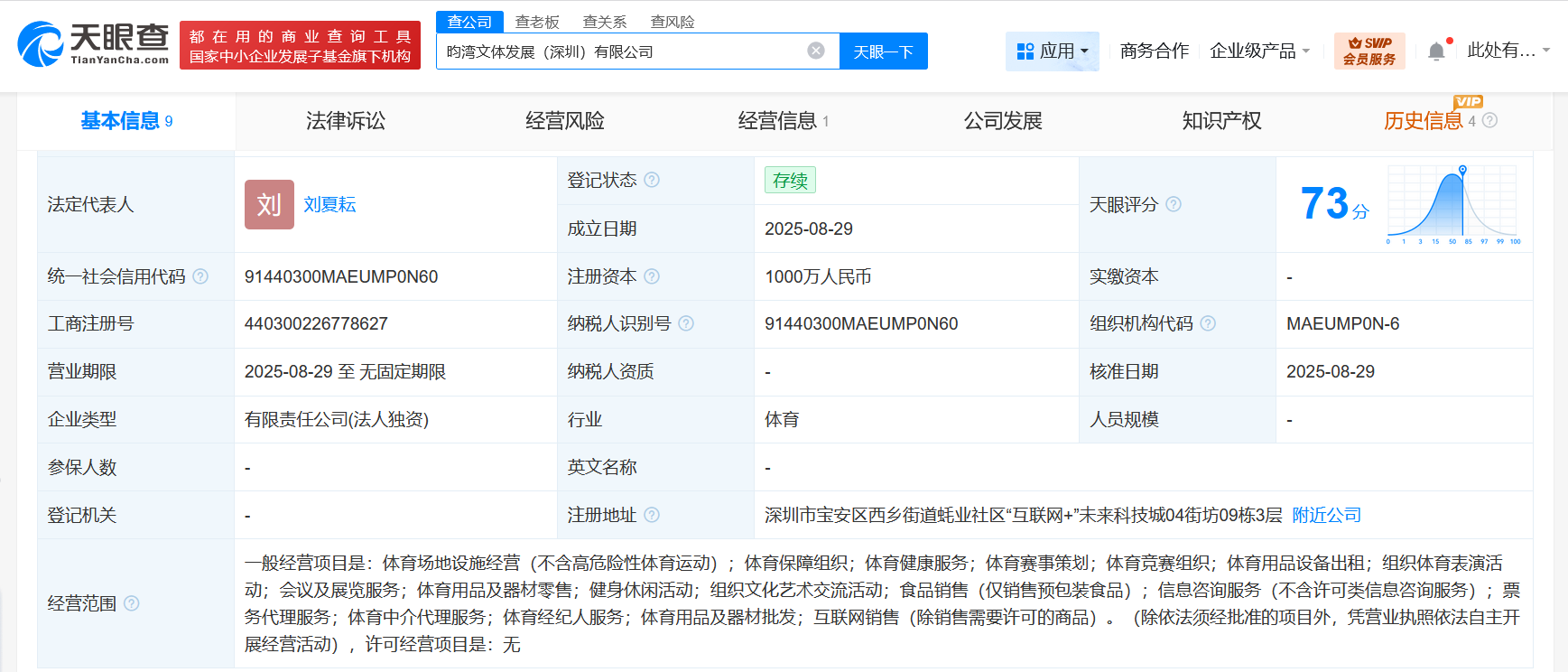 天眼查工商信息显示,近日,昀湾文体发展(深圳)有限公司成立,法定代表人为刘夏耘,注册资本1000万人民币,经营范围含体育场地设施经营、体育保障组织、体育健康服务、体育赛事策划、组织体育表演活动、会议及展览服务、食品销售、信息咨询服务、票务代理服务等。股东信息显示,该公司由腾讯旗下深圳昀湾商业管理有限公司全资持股。