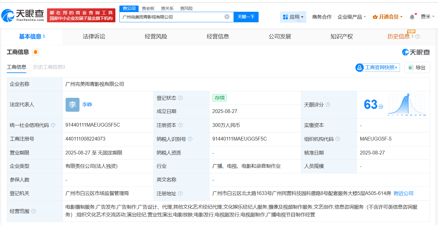 天眼查工商信息显示,近日,广州完美雨青影视有限公司成立,法定代表人为李峥,注册资本300万人民币,经营范围包括电影摄制服务、广告发布、广告制作等。股权全景穿透图显示,该公司由完美世界(002624)旗下重庆完美世界影视有限公司全资持股。
