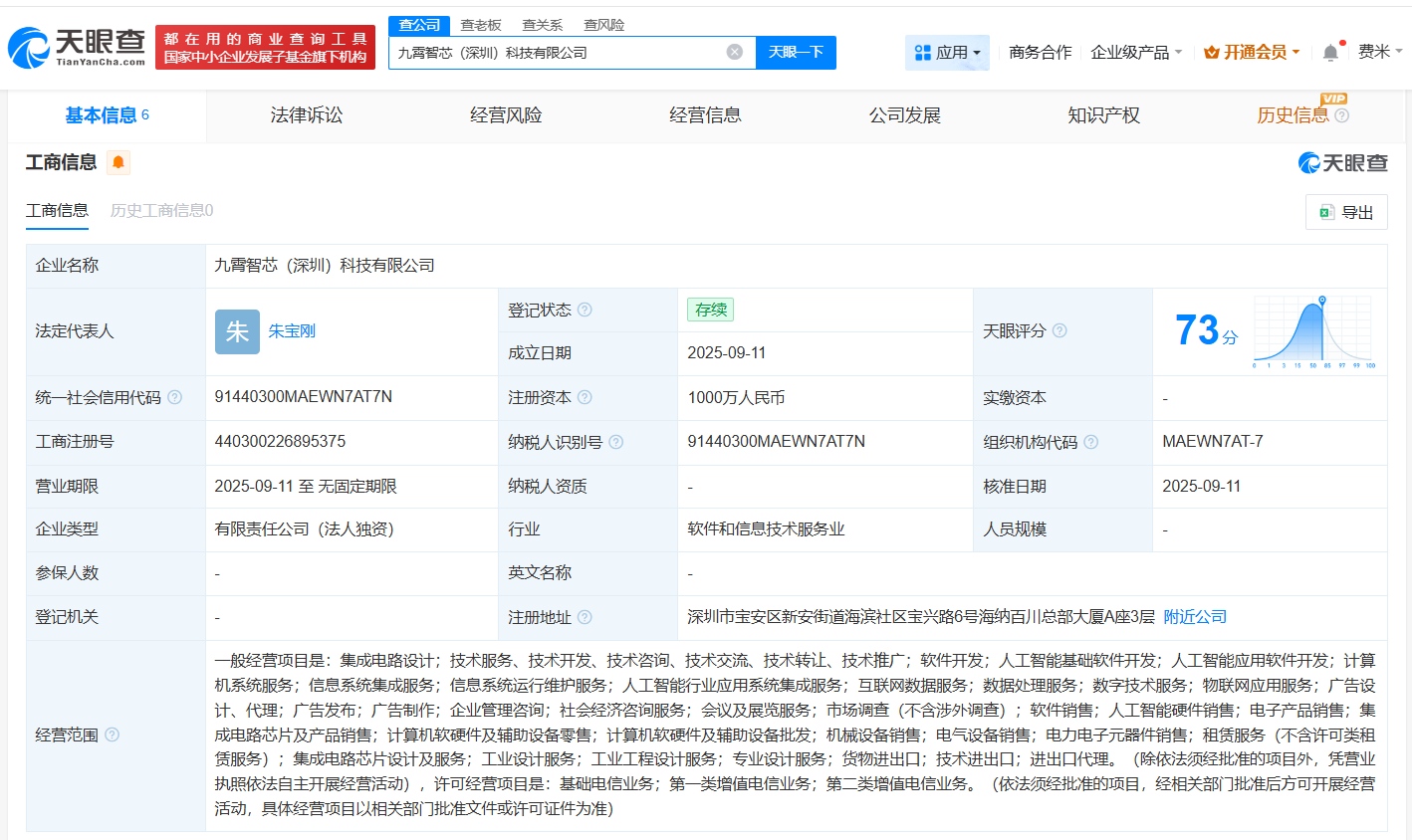 天眼查工商信息显示,近日,九霄智芯(深圳)科技有限公司成立,法定代表人为朱宝刚,注册资本1000万人民币,经营范围包括集成电路设计、人工智能基础软件开发、人工智能应用软件开发等。股东信息显示,该公司由昆仑芯(北京)科技有限公司全资持股。