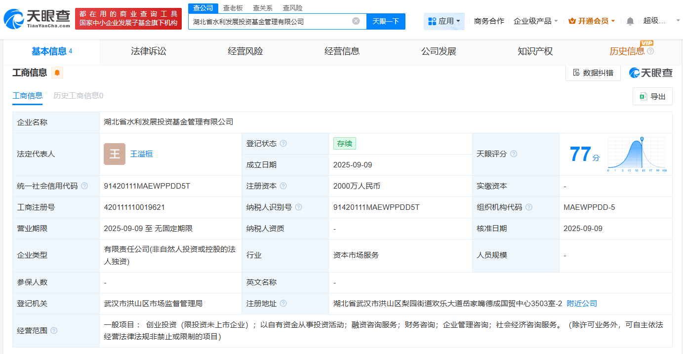 天眼查工商信息显示,近日,湖北省水利发展投资基金管理有限公司成立,法定代表人为王溢桓,注册资本2000万人民币,经营范围包括创业投资、以自有资金从事投资活动、融资咨询服务等。股东信息显示,该公司由湖北水发资本投资有限公司全资持股。