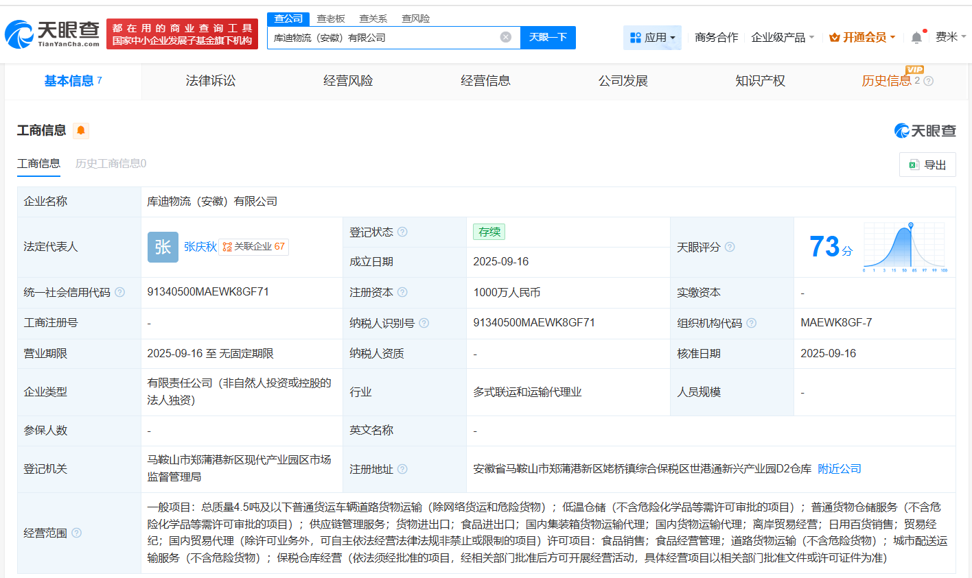 天眼查App显示,近日,库迪物流(安徽)有限公司、库迪运输(安徽)有限公司成立,法定代表人分别为张庆秋、张志刚,注册资本均为1000万人民币,经营范围包括低温仓储、普通货物仓储服务、贸易经纪等。股东信息显示,上述两家公司均由库迪供应链(安徽)有限公司全资持股。
