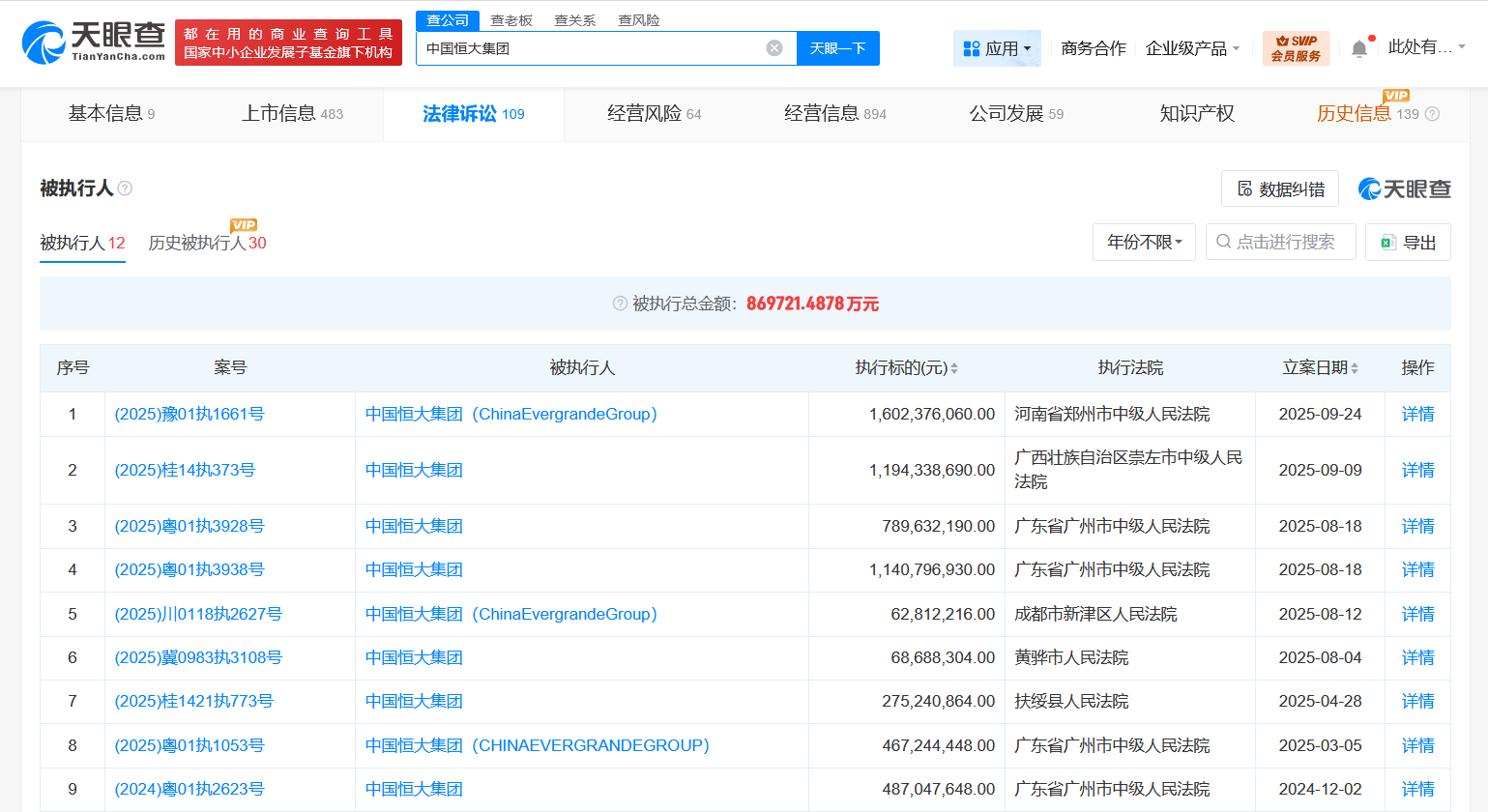 天眼风险信息显示,中国恒大集团现存12条被执行人信息,被执行总金额超86亿元,此外,该公司还存在失信被执行人(老赖)及终本案件信息。