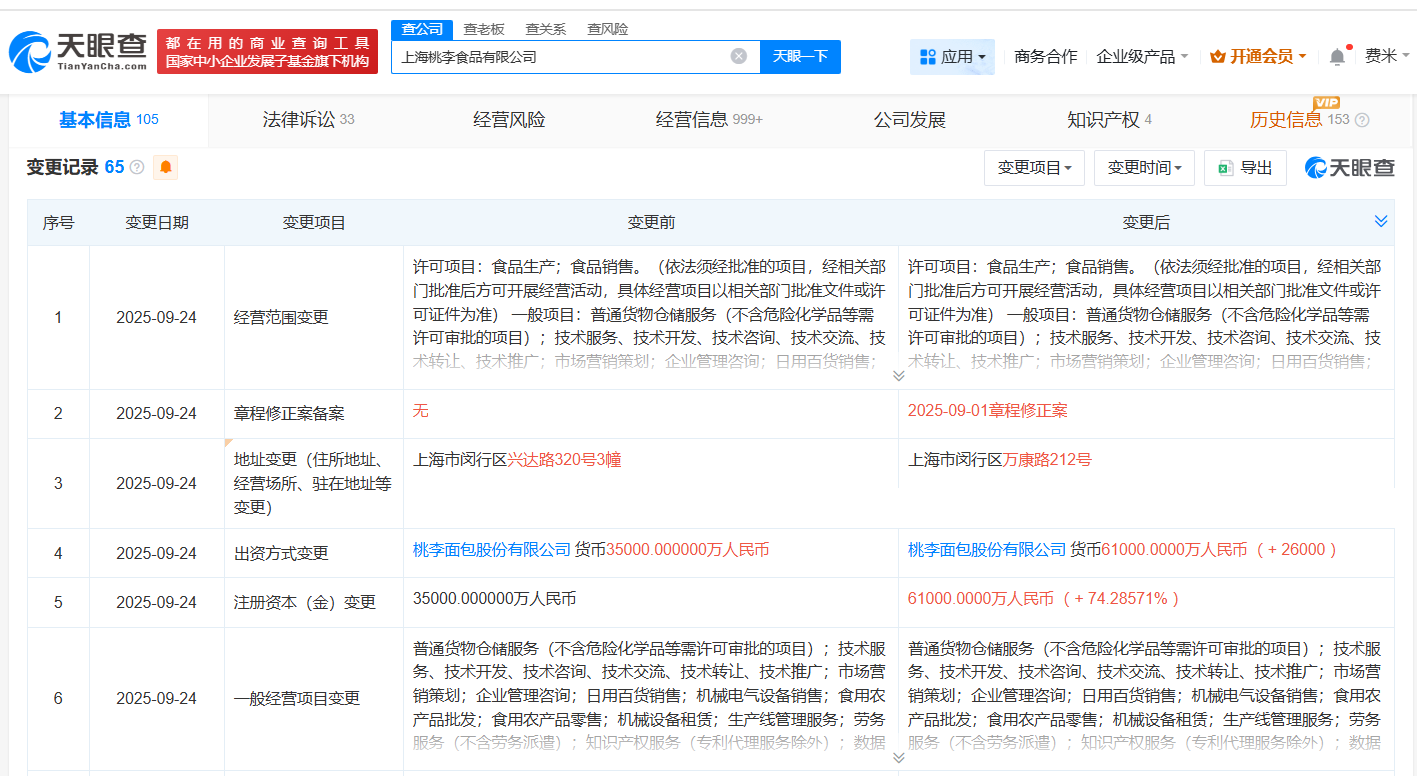 天眼查App显示,近日,上海桃李食品有限公司发生工商变更,注册资本由3.5亿人民币增至6.1亿人民币,增幅约74%。