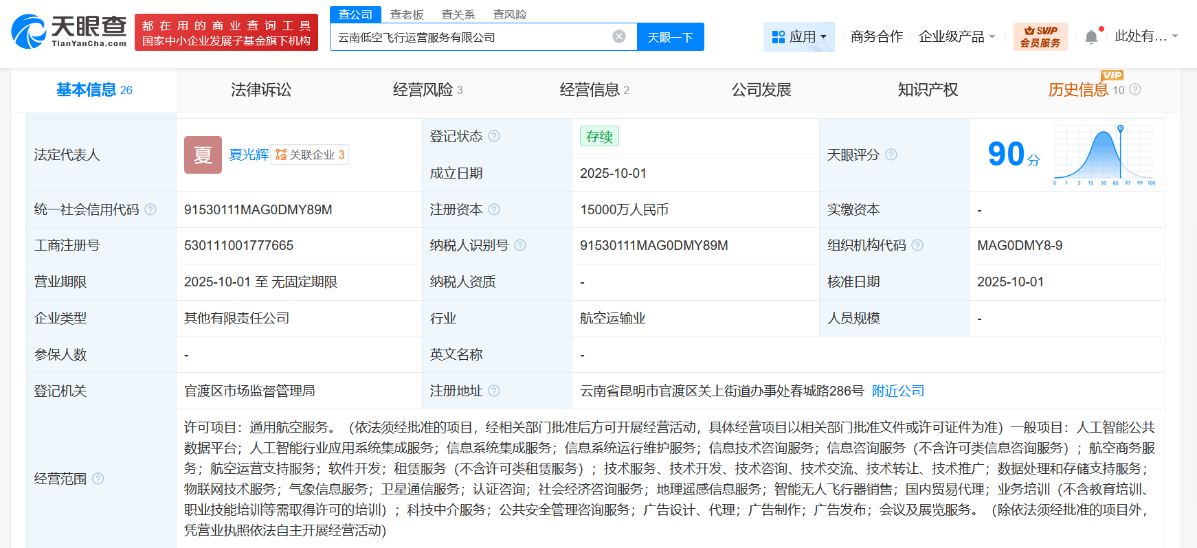 天眼查App显示,近日,云南低空飞行运营服务有限公司成立,法定代表人为夏光辉,注册资本1.5亿人民币,经营范围含通用航空服务、人工智能公共数据平台、人工智能行业应用系统集成服务、信息系统集成服务、信息系统运行维护服务、信息技术咨询服务、信息咨询服务、航空商务服务等。股东信息显示,该公司由云南机场集团有限责任公司、云南省交通投资建设集团有限公司、云南省交通发展投资有限责任公司共同持股。