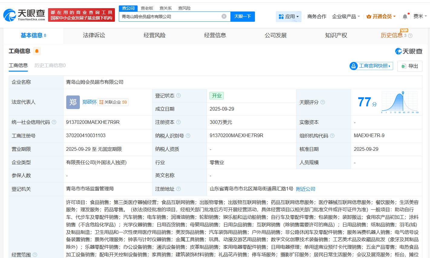 天眼查App显示,近日,青岛山姆会员超市有限公司成立,法定代表人为郑硕怀,注册资本300万美元,经营范围包括食品销售、第三类医疗器械经营、食品互联网销售等,由山姆(上海)投资有限公司全资持股。