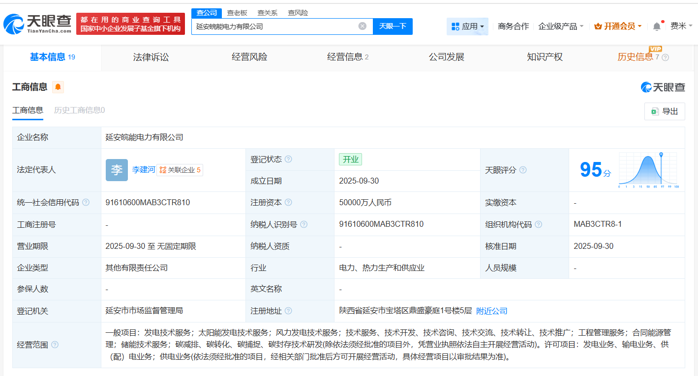 天眼查App显示,近日,延安皖能电力有限公司成立,法定代表人为李建河,注册资本5亿人民币,经营范围包括发电技术服务、太阳能发电技术服务、风力发电技术服务等,由皖能电力(000543)、阳光电源(300274)旗下阳光新能源开发股份有限公司、安徽国轩新能源投资有限公司共同持股。