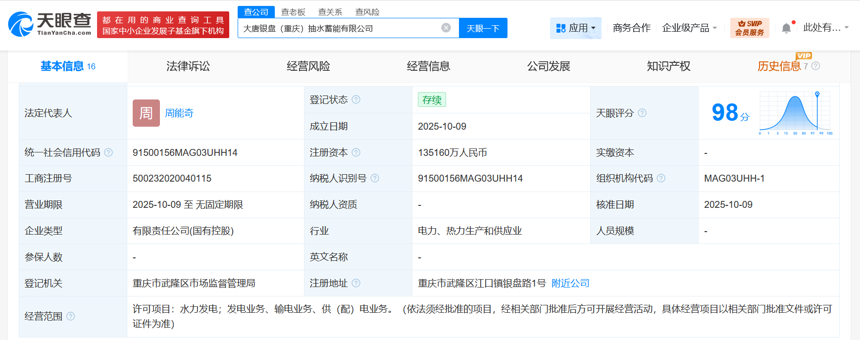 天眼查工商信息显示,近日,大唐银盘(重庆)抽水蓄能有限公司成立,法定代表人为周能奇,注册资本约13.5亿人民币,经营范围为水力发电,发电业务、输电业务、供(配)电业务。股东信息显示,该公司由大唐发电(601991)、重庆发展能源有限公司、重庆武隆城市发展(集团)有限公司共同持股。
