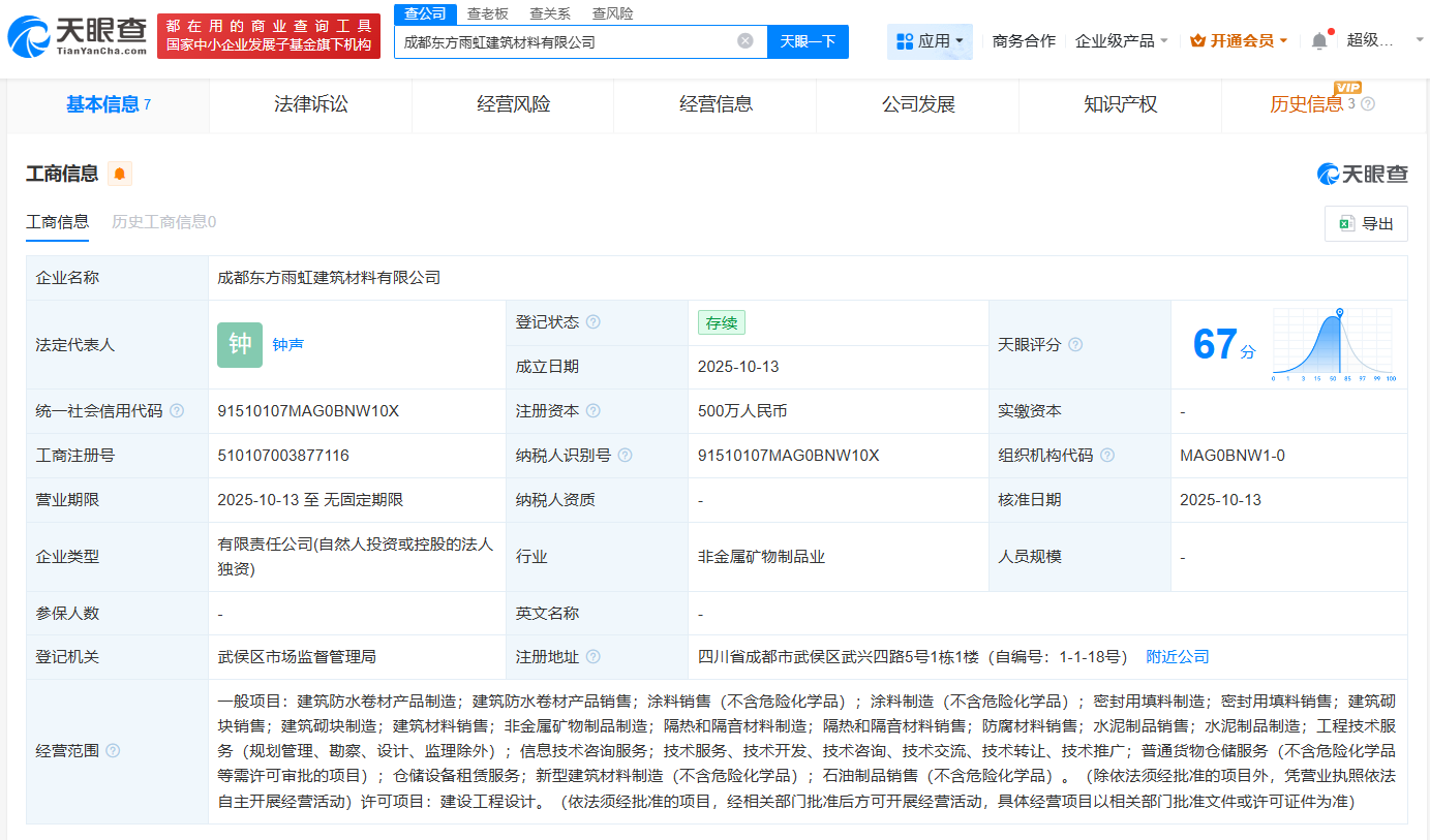 天眼查App显示,近日,成都东方雨虹建筑材料有限公司成立,法定代表人为钟声,注册资本500万人民币,经营范围包括建筑防水卷材产品制造、建筑防水卷材产品销售、涂料销售、建筑砌块制造等。股东信息显示,该公司由东方雨虹(002271)全资持股。