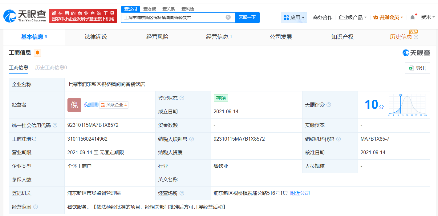 天眼查App显示,涉事的上海市浦东新区祝桥镇闻闻香餐饮店成立于2021年9月,为个体工商户,经营者为倪某某,经营范围为餐饮服务。