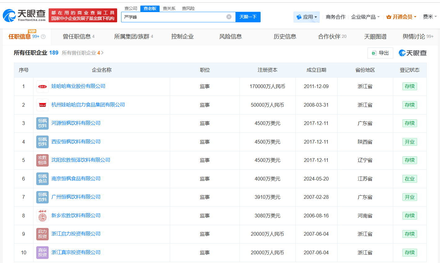 天眼查App显示,严学峰名下关联近190家企业,其中180余家处于存续状态,包括娃哈哈商业股份有限公司、河源恒枫饮料有限公司、浙江迅尔城通货运有限公司等。值得一提的是,严学峰名下关联近百家娃哈哈企业,包括杭州娃哈哈启力食品集团有限公司、杭州娃哈哈乐维食品有限公司等,严学峰在上述公司担任监事。合作伙伴信息显示,严学峰与宗馥莉共同关联188家企业,包括浙江启力投资有限公司、浙江真宗投资有限公司等。