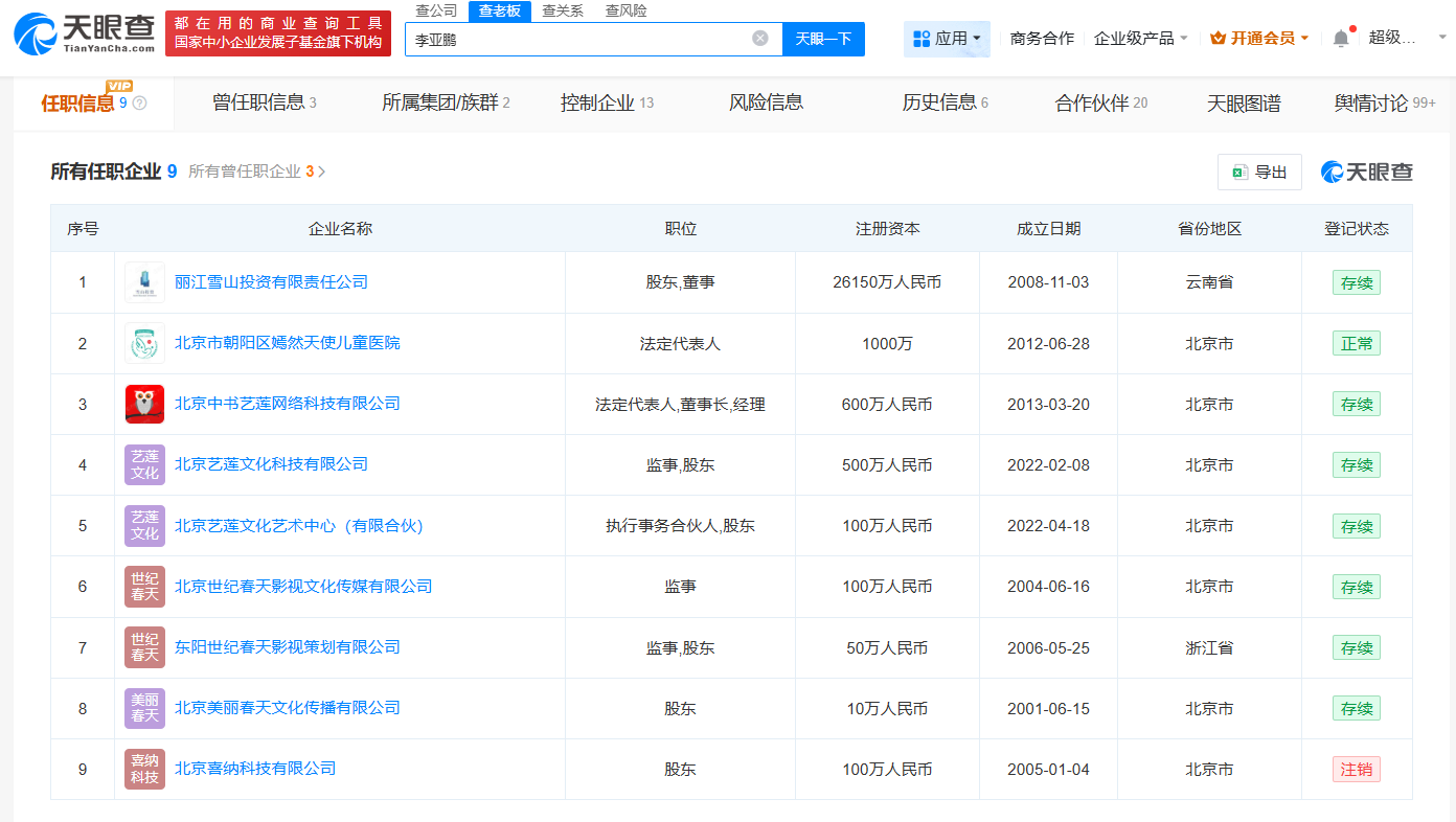 天眼查任职信息显示,李亚鹏名下关联9家企业,其中8家为存续状态,包括丽江雪山投资有限责任公司、北京中书艺莲网络科技有限公司、东阳世纪春天影视策划有限公司等。李亚鹏在上述公司担任董事、监事等职务,与海哈金喜无商业关联。
