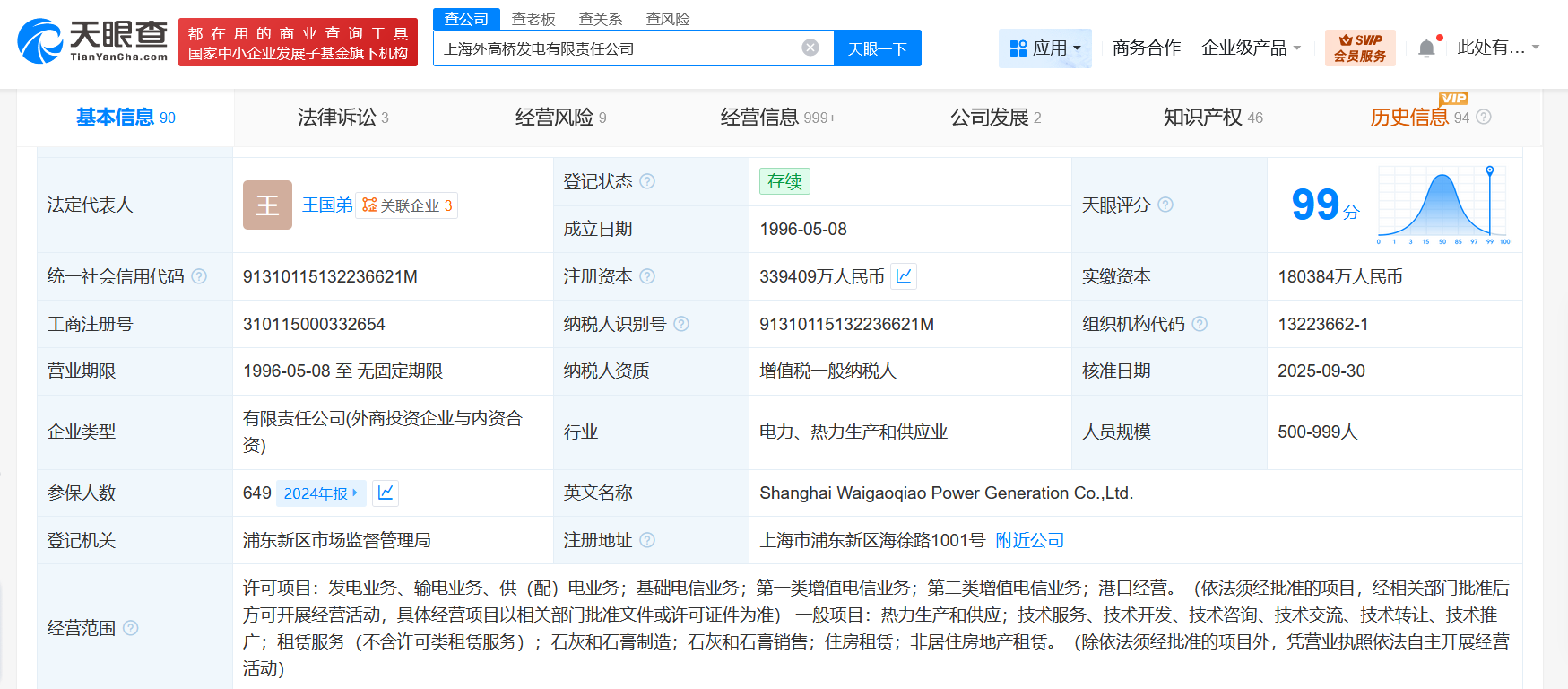 天眼查工商信息显示,近日,上海外高桥发电有限责任公司发生工商变更,注册资本由约18.04亿人民币增至约33.94亿人民币,增幅约88%。